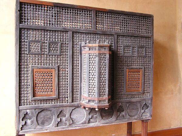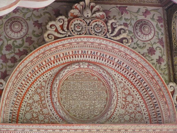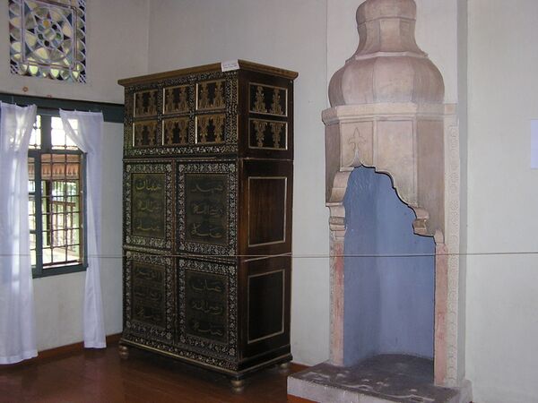В южной стене расположен михраб, в верхней части которого вырезано семь орнаментированных поясов, символизирующих семь уровней небес[41]. Над михрабом есть витраж, на котором изображена печать Сулеймана (гексаграмма). На стенах малой мечети были обнаружены выцарапанные изображения лодок с парусами, лошадей и всадников[25].