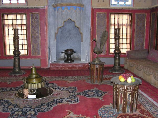 На стенах лепнина из алебастра[25], изображающая вазы с фруктами. По карнизу вдоль трёх стен тянется поэтическая надпись на арабском языке в честь Крыма Герая[39]. Вдоль одной из стен стоят шкафы с посудой; в ней же сделаны камин и входная дверь[40]. Над входной дверью в застекленных антресолях стояла изготовленная из воска[8] композиция зимнего сада из искусственных миниатюрных деревьев, цветов и птиц. Во время немецкой оккупации Крыма она исчезла[39].