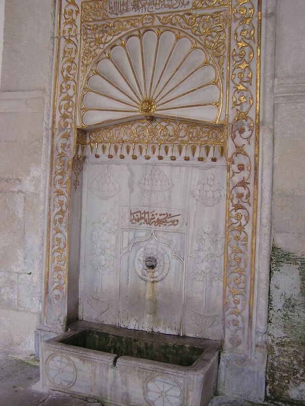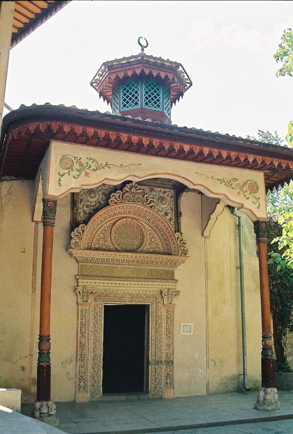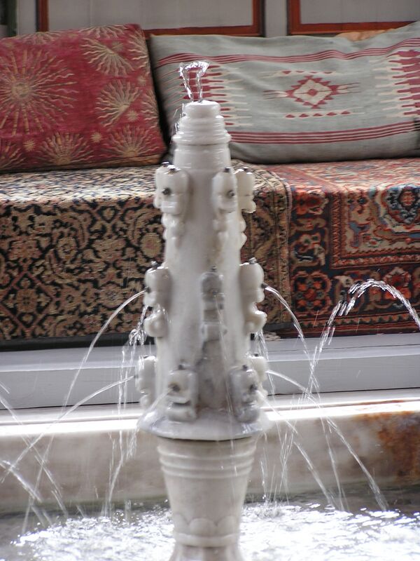 «Фонтан слёз» был создан в 1764 году иранским зодчим Омером. Он был установлен у дюрбе Диляры-бикеч[45]. Со временем источник, питавший фонтан на старом месте, иссяк. К приезду в Ханский дворец Екатерины II фонтан был перенесён в Фонтанный дворик, где находится по сей день. В Бассейном дворике дворца есть похожий фонтан.