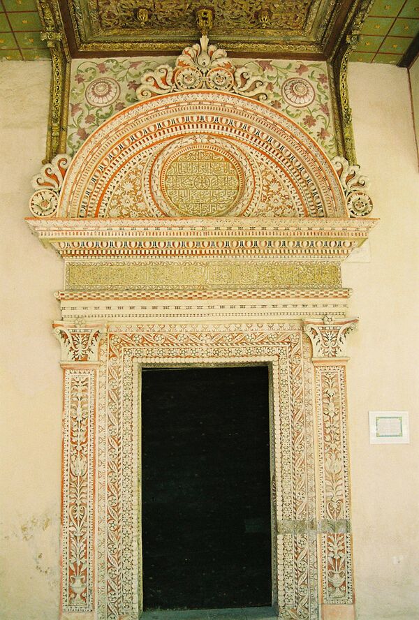 Этот величественный порог и эта возвышенная дверь построены по приказу государя двух материков и хакана двух морей, государя, сына государя, Менгли Герая хана, сына государя Хаджи Герая хана. 909 (1503).