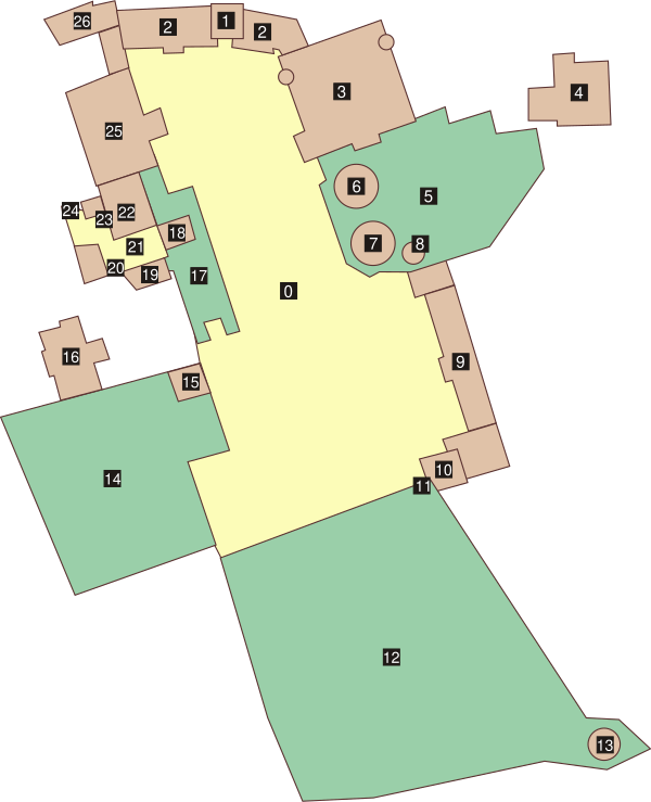 | Большая Ханская мечеть • Конюшенный корпус • Библиотечный корпус • Главный корпус • Гаремный корпус • Соколиная башня | |