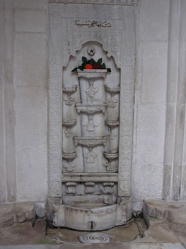 Фонтан сделан по типу «Сельсебиль» (Сельсебиль — один из райских источников, из которых, по верованию мусульман, пьют воду души праведников, павших за веру)[47]. В центре расположен мраморный цветок, из которого в большую верхнюю чашу капает вода, напоминая слёзы. Из большой чаши вода попадает в две меньшие по размеру, оттуда — снова в большую, и так несколько раз. Наполнение чаши водой символизирует наполнение сердца горем, а изменение размеров чаш — то, что горе то усиливается, то утихает[45].