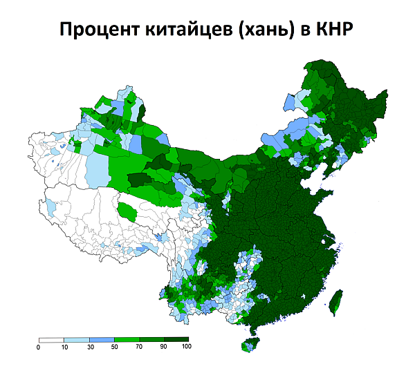 В 1949 году в китайской гражданской войне побеждают коммунисты и создают новое государство — Китайскую Народную Республику. Сторонники прошлой власти бегут на остров Тайвань. При содействии СССР в КНР были включены Восточно-Туркестанская Республика, Внутренняя Монголия и Тибет, народы которых ранее воспользовались правом самоопределения после распада империи Цин. В то же время в КНР организуется миграция в периферийные районы, так, в Синьцзяне доля ханьского населения увеличивается с 10 до 40 процентов.