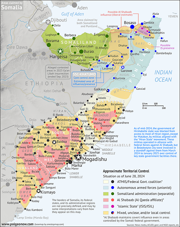 Однако в 2023 году внутренний политический конфликт подорвал кампанию правительства Сомали по борьбе с повстанцами, а соперничество кланов открыло возможность группировке перетянуть на свою сторону некоторые небольшие кланы.
