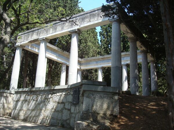 Достопримечательностью парка также является беседка, состоящая из 12 мраморных колонн с фонтаном посредине. По мнению археолога К. К. Орлова (руководителя раскопок Харакса), колонны беседки представляют собой часть сгоревшего в 1882 году дворца (копии атриума римского дома в Помпеях).