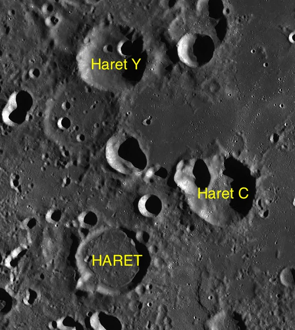 - Образование сателлитного кратера Харет C относится к нектарскому периоду[4].