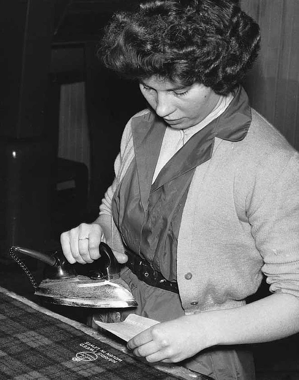 Затем твид возвращается на фабрику в своем «жирном состоянии», и здесь он проходит через руки ткачей, которые исправляют любые недостатки.