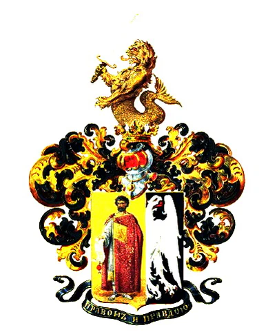 Щит увенчан дворянским коронованным шлемом. Нашлемник: фигура золотого льва, обращённого вправо, с рыбьим хвостом, держащего в правой лапе серебряный с золотой рукоятью меч. Намёт: чёрный с золотом. Девиз: «ПРАВОМ И ПРАВДОЮ» золотыми буквами на чёрной ленте.