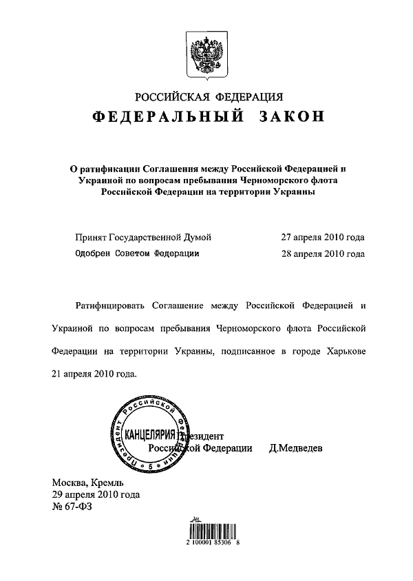 Федеральный закон «О ратификации Соглашения между Российской Федерацией и Украиной по вопросам пребывания Черноморского флота Российской Федерации на территории Украины» был принят Государственной Думой 27 апреля 2010 года и одобрен Советом Федерации 28 апреля 2010 года. За ратификацию проголосовало 410 депутатов Государственной Думы. Воздержалась от поддержки фракция ЛДПР[7].