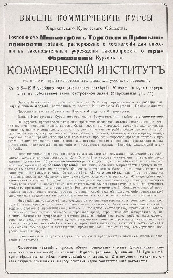 «Вчера в здании Харьковского коммерческого училища состоялось открытие Высших коммерческих курсов, имеющих в недалёком будущем быть преобразованными в Коммерческий институт».