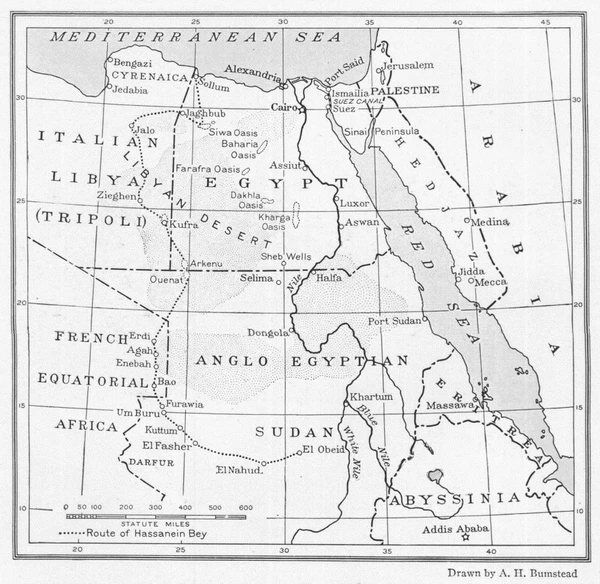 В 1923 году совершил уже самостоятельное путешествие в оазис Куфра в Ливии, пересёк регион, защищаемый сануситами. Дальнейший путь к югу через безводные пески пустыни оказался очень тяжёлым, на протяжении более 400 км встретился всего лишь один колодец. В начале июня, пройдя более 2 тыс. км и выполнив меридиональное пересечение Ливийской пустыни, Хассанейн добрался до первого селения в Дарфуре, близ 16° с. ш. Оттуда он повернул к юго-востоку, вышел на караванную дорогу и по ней достиг Нила. Съёмка, выполненная Хассанейном, явилась важным дополнением к материалам, которые позволили ликвидировать одно из последних значительных «белых пятен» на карте Африканского континента.