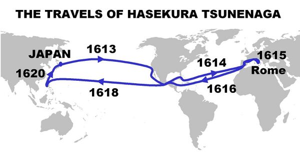 Хасэкура Рокуэмон Цунэнага (яп. 支倉六右衛門常長, 1571—1622)[4] — самурай, первый японец, побывавший в Европе с дипломатической миссией (на Западе был известен как «дон Фелипе»). Датэ Масамунэ, даймё города Сэндай, в 1613 году отправил посла в Европу с целью установления торговых[4] и дипломатических[5] связей. Посольство пересекло Тихий океан, достигло Акапулько в Мексике, а затем отправилось в Мадрид и Рим. В знак особого расположения Ватикана Хасэкура Цунэнага был объявлен римским гражданином[6]. Путешествие до Европы и обратно растянулось на 7 лет. Следующее японское посольство в Европу прибыло только более двухсот лет спустя, в 1862 году.