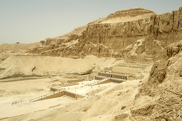 К первой из террас вела длинная аллея полихромных песчаниковых сфинксов царицы, обсаженная завезёнными из Пунта мирровыми деревьями. Сфинксы находились с двух сторон дороги шириной приблизительно в 40 метров, ведущей от нижней террасы храма к границе пустыни и орошаемых полей долины Нила, где был воздвигнут гигантский пилон.