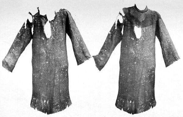 А. Н. Кирпичников отмечает, что в русских землях вообще неизвестны соединенные в одно целое кольчужные капюшоны с кольчугой и/или кольчужные штаны, которые он относит к принадлежностям западноевропейского рыцарского вооружения. В XIII в. в русской тяжелой кавалерии из кольчужной защиты начинают распространяться длиннополые кольчуги и кольчужные чулки.[4]