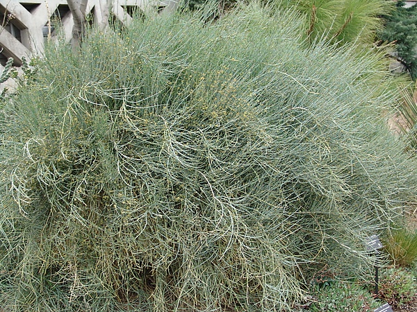 Многолетний, густоветвистый кустарник высотой до 1—1,5 м. Корень толстый, длинный, ветвистый. Стебель одиночный или в числе нескольких, толстый, от основания ветвистый, деревенеющий, серый; веточки вверх направленные, прямые, торчащие, диаметром 1,5—2 мм, членистые, гладкие, зелёные, тонко бороздчатые, с междоузлиями до 2 см.