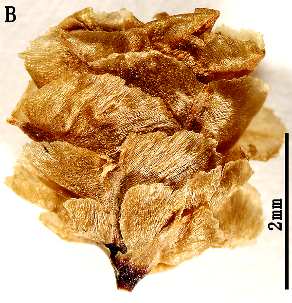 Плоды длиной 6—7 мм, с растопыренными, отогнутыми верхушками прицветных чешуек. Семена тёмно-серые или зеленоватые, длиной 5—6 мм, овальные или эллиптические, по спинке слабо-килеватые.