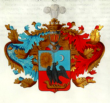 Щит разделён горизонтально на две части, из которых в верхней части, в лазоревом поле, изображены: золотое солнце (слева) и (справа) серебряная луна, рогами обращённая в левую сторону. В нижней части, в красном поле, на золотом драконе чёрный орёл, в клюве которого золотой крест приходится (вместе с головою орла) на лазоревом поле верхнего отдела вместе с верхами крыльев, заходящими из нижнего поля, таким образом, как бы орёл изображён поверх разделения щита.