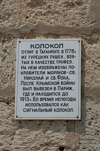 «Колокол отлит в Таганроге в 1778 году из турецких пушек, взятых в качестве трофея. На нём изображены покровители моряков — св. Николай и св. Фока. После Крымской войны был вывезен в Париж, где и находился до 1913 г. Во время непогоды использовался как сигнальный колокол.»