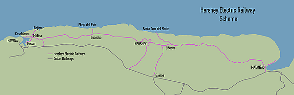 Для строительства железной дороги была создана дочерняя компания Hershey Cuban Railway 31 марта 1916 года, полностью принадлежащая агрохолдингу. Центральным узлом железной дороги стал город Херши. Первый участок был запущен в 1917 году.[2]