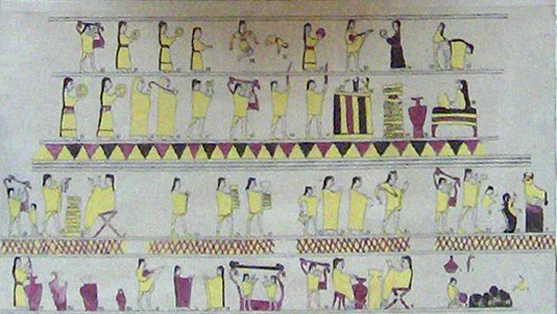 Арфа не была обнаружена в литературных источниках. Художественные изображения, на которых могла бы быть изображена арфа, очень редки и сохранились лишь во фрагментарной форме. Это резко контрастирует с ситуацией в Месопотамии, где арфы были важнейшим инструментом, особенно в ритуалах[18].