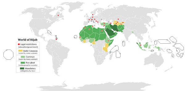 В некоторых странах правительства поощряют ношение хиджаба женщинами, в других ношение хиджаба обязательно, в третьих его полностью или частично запрещают. В ряде стран, где ношение хиджаба не распространено и запрещено законом, активистки борются за право на ношение хиджаба в государственных учреждениях и школах в качестве символа своей религиозной идентичности[2][9].