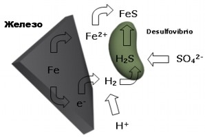Fe2+ + FeS2 + H2 ⇆ 2 FeS + 2 H+ ΔG°' = −44,2 кДж/моль