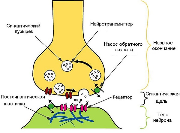 В синаптическом расширении имеются мелкие везикулы, так называемые пресинаптические или синаптические пузырьки, содержащие либо медиатор (вещество-посредник в передаче возбуждения), либо фермент, разрушающий этот медиатор. На постсинаптической, а часто и на пресинаптической мембранах присутствуют рецепторы к тому или иному медиатору.