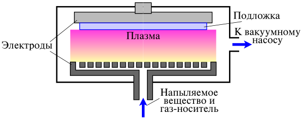 - Усиленный плазмой CVD (англ. Plasma enhanced chemical vapor deposition (PECVD)) — CVD-процесс, который использует плазму для разложения исходных веществ, активации поверхности подложки и ионного травления. За счёт более высокой эффективной температуры поверхности подложки, данный метод применим при более низких температурах и позволяет получать покрытия, равновесные условия синтеза которых недостижимы иными методами из-за недопустимости перегрева подложек или иных причин. В частности, этим методом успешно получают алмазные плёнки и даже относительно толстые изделия, такие как окна для оптических систем[1].