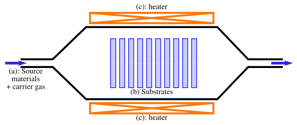 - CVD с горячей нитью (англ. Hot wire chemical vapor deposition (HWCVD) / hot filament CVD (HFCVD)) — также известен как каталитический CVD (англ. Catalitic chemical vapor deposition (Cat-CVD)). Использует горячий носитель для ускорения реакции газов.