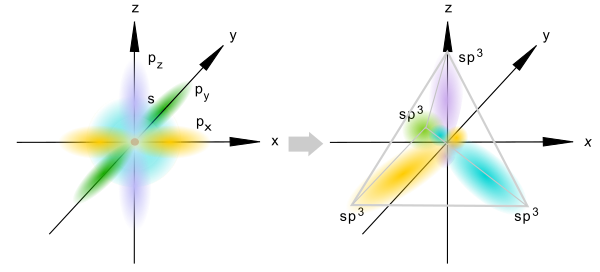 Данный вид гибридизации происходит при смешивании одной s- и трех p-орбиталей, образуя четыре равноценные по форме и энергии sp3-гибридные орбитали.