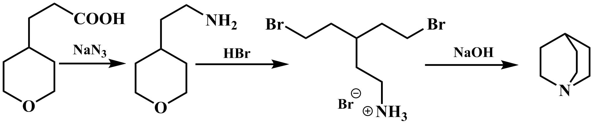 Группой В. Прелога был предложен синтез хинуклидина из 2-(4-тетрагидропиран)пропионовой кислоты. На первом этапе кислоту вводили в реакцию с азидом натрия с образованием 4-(2-аминоэтил)тетрагидропирана, который затем кипятили с бромоводородом в течение 7 часов, получив 1,5-дибром-3-(2-аминоэтил)пентан, на который действовали гидроксидом натрия, под действием которого происходила циклизация с образованием хинуклидина[3]: