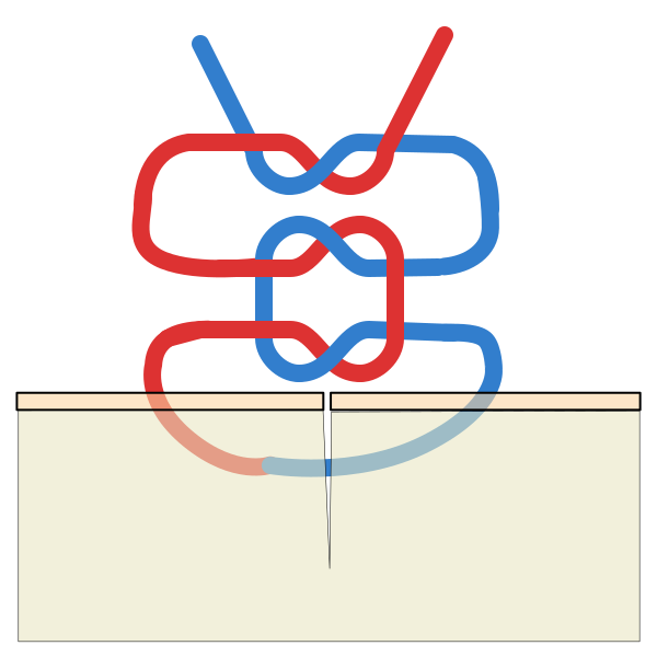 - а) параллельный узел (прямой узел — полуузлы завязаны в разных направлениях)