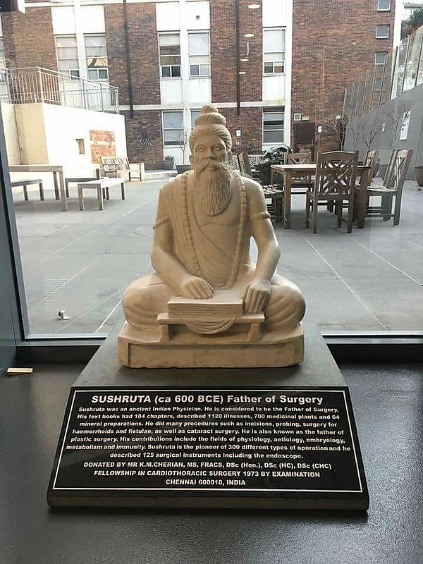Сушрута (около 600 г. до н. э.)[14] считается «отцом хирургии». Его период обычно относят к 1200—600 годам до н. э.[15]. Одно из самых ранних упоминаний этого имени встречается в «Рукописи Бауэра», где Сушрута указан как один из десяти мудрецов, проживавших в Гималаях[16]. Тексты также предполагают, что он изучал хирургию в Каши у лорда Дханвантари, бога медицины в индуистской мифологии[17]. Он был одним из первых новаторов в области пластической хирургии, который преподавал и практиковал хирургию на берегах Ганга в районе, соответствующем современному городу Варанаси в Северной Индии. Большая часть того, что известно о Сушруте, содержится на санскрите в серии томов, автором которых он является и которые в совокупности известны как «Сушрута-самхита». Это один из старейших известных хирургических текстов, в котором подробно описаны обследование, диагностика, лечение и прогноз многочисленных заболеваний, а также процедуры по выполнению различных видов косметической хирургии, пластической хирургии и ринопластики[18].