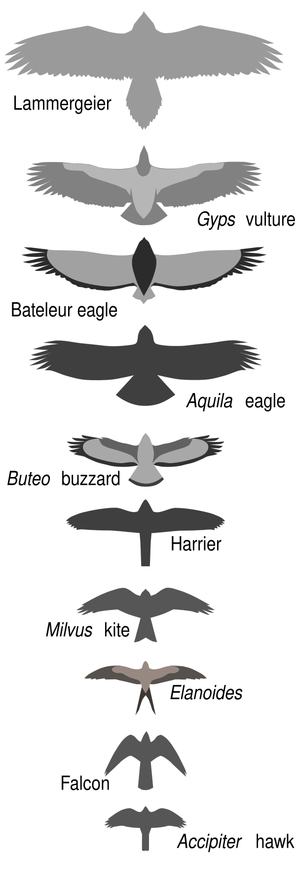- Соколы и пустельги — средние по размеру хищные птицы с длинными заострёнными крыльями, многие из них особенно быстрые летуны. Они относятся к семейству Falconidae, лишь отдалённо связанному с Accipitriformes. Каракары — отдельная подгруппа Falconidae, уникальная для Нового Света, наиболее распространённая в неотропиках — их широкие крылья, голые лица и всеядность указывают на определённую степень конвергенции с Buteo или грифами, или с обеими группами.