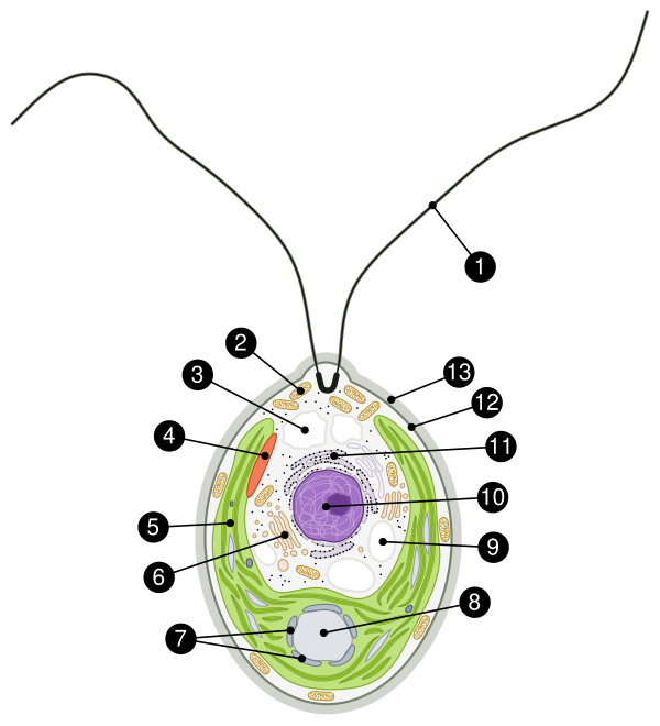 Многие виды могут активно передвигаться с помощью вращательного движения двух жгутиков, как бы ввинчиваясь в воду. Обычно каждая клетка-водоросль содержит две сократительные вакуоли для регуляции осмотического давления, один крупный хроматофор с пиреноидом в его нижней части, а также красное пигментное тельце, называемое красным светочувствительным глазком. Глазок представляет собой скопление глобул, содержащих красный пигмент — гематохром. Глазок реагирует на свет, и хламидомонада с помощью биения жгутиков движется по направлению к свету — это называется положительным фототаксисом. Также имеет механотаксис, хемотаксис. Хроматофор (хлоропласт) представлен в виде чаши, занимающей большую часть клетки, в нём откладывается крахмал. Основной компонент клеточной стенки — гликопротеины, богатые гидроксипролином. В клеточной стенке также присутствует растворимая фракция моносахаридов и олигосахаридов. Вопреки данным ранних работ, целлюлоза в ней отсутствует.