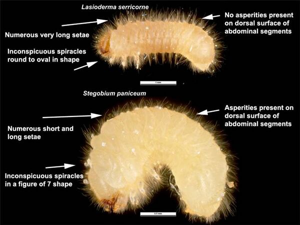 Личинка дугообразно изогнутая, грязно-белого цвета. Тело мягкое, мясистое, покрыто волосками. На спине короткие шипики. Голова светло-коричневая либо жёлто-коричневая. Верхние челюсти личинки очень хорошо развиты, покрыты зубцами. Грудные сегменты тела более вздутые, чем остальные, анальная щель продольная. Ног три пары, они трёхчлениковые, слаборазвитые. Взрослая личинка длиной до 5,6 мм.