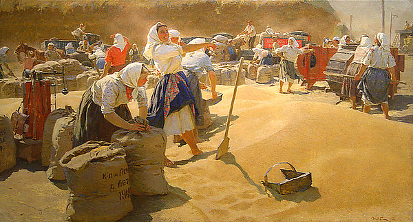 В солнечном золотистом колорите этого полотна, в исполненных здоровья и молодого задора образах девушек, ссыпающих в мешки зерно нового урожая, много светлого, яркого и праздничного. Художница утверждает жизнь, радость коллективного труда. Она любуется ловкими движениями колхозниц, их душевным здоровьем и ясным, открытым характером.