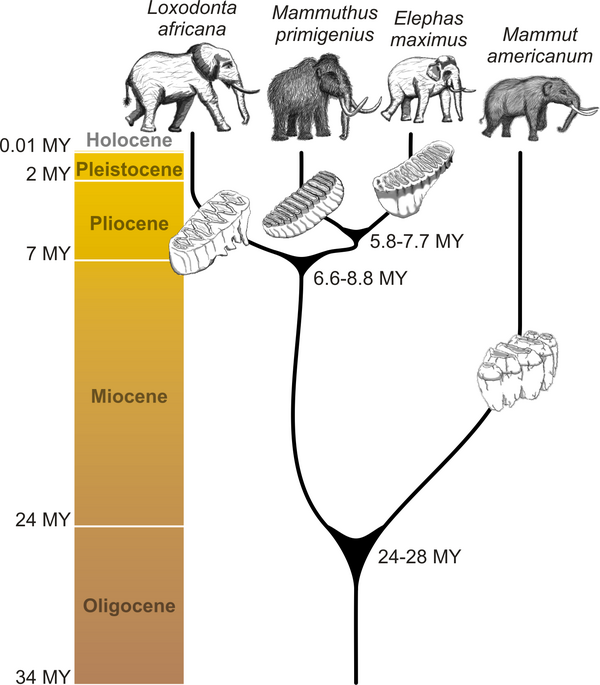 Хоботные образования в начале едва были заметны и служили предкам хоботных, живущим в болотах, как средство для дыхания под водой, похожее по своей сути на шноркель. Позже хоботы, с их множеством мускулов, развились в тонкочувственные хватательные органы, позволявшие срывать и листья с деревьев, и травы в степях. Другой адаптацией к жизни в воде явилась толстая кожа, эффективно противостоящая внешнему давлению воды, позволяя нормально дышать. Волосяной покров современных хоботных редуцирован.
