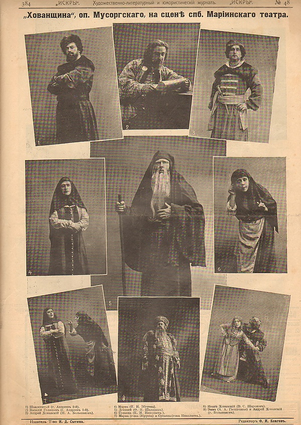 О постановке «Хованщины» в Частной опере известно из воспоминаний певца Василия Шкафера и племянника Саввы Мамонтова. Последний отмечал, что в проводимых перед репетициями беседах принимали участие художники, работавшие над постановкой. На самой первой беседе Аполлинарий Васнецов рассказал, что на Рогожском старообрядческом кладбище многое сохранилось с давней старины[95]. Шкафер вспоминает, что Савва Мамонтов на одной из репетиций предложил сходить к старообрядцам в Преображенское. Ныне входящее в состав Москвы, село в те времена состояло из «маленьких домишек, незамощённых грязных улочек и огромных пустырей». Василий Шкафер вспоминал, что для актёров, посетивших село старообрядцев, песнопение в храме было неестественным и «резало уши», а в местных людях они узнавали героев оперы; «конечно же это не подлинная допетровская Русь <…> но нам нужны были хотя бы мазочки, намёки, лёгкие штрихи от быта <…> и, уходя не пустыми, пришли в театр, делясь всем виденным и слышанным»[96]. Также в год постановки «Хованщины» на сцене Частной оперы общественность широко обсуждала погребение заживо в знак протеста двух групп старообрядцев в Тираспольском уезде. Эта трагедия изучалась и психиатрами, и врачами, и историками[97].