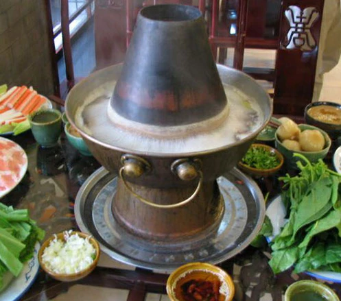 Для простых китайцев «Хого» (дословно «горячий котелок», иначе — «монгольский котелок») — скорее не блюдо, а способ приготовления еды и общения друг с другом, когда ингредиенты, подобранные по вкусу, варят в общем котелке, перемежая еду разговорами. Особенно славится хого провинции Сычуань. В ресторанах, в которых подают хого, используются особые столы, в их центре находится печь, на которую устанавливают горшок с бульоном или соусом (часто горшки разделены на два сектора, так что в них можно сразу приготовить два разных кушанья, обычно острое хого и неострое хого). Гостям подают сырые продукты, которые впоследствии и станут ингредиентами хого: мясо, морепродукты, овощи, тофу, лапшу, пельмени — их набор не стандартизован. Каждый посетитель самостоятельно регулирует температуру блюда, время приготовления различных ингредиентов и очерёдность их опускания в горячий бульон. Как правило, в самом Китае бульон подают очень острый, хотя можно заказать бульон и без большого количества специй. В Китае есть разные виды хого: острый, неострый и хого, который делится на эти две части (в самом самоваре есть разделитель, с одной стороны которого находится острый бульон, а с другой — обычный). Есть полезные и питательные хого, рыбные хого, хого с морским огурцом, грибные, хого с мясом на кости, из кишок, с рыбой и маринованной китайской капустой, с курицей, уткой, кроликом и так далее[4].