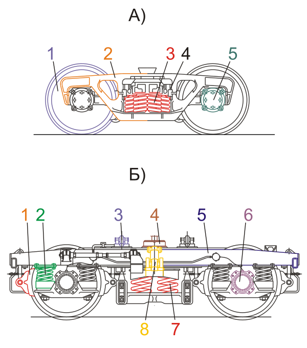В тележках грузовых вагонов используются фрикционные гасители колебаний, они не имеют люлечного устройства и имеют, как правило, одноуровневое рессорное подвешивание. (см. верхний рисунок). Восьмиосные полувагоны и цистерны устанавливаются на четырёхосные тележки, основой которых являются те же двухосные, но связанные между собой штампосварной соединительной балкой.