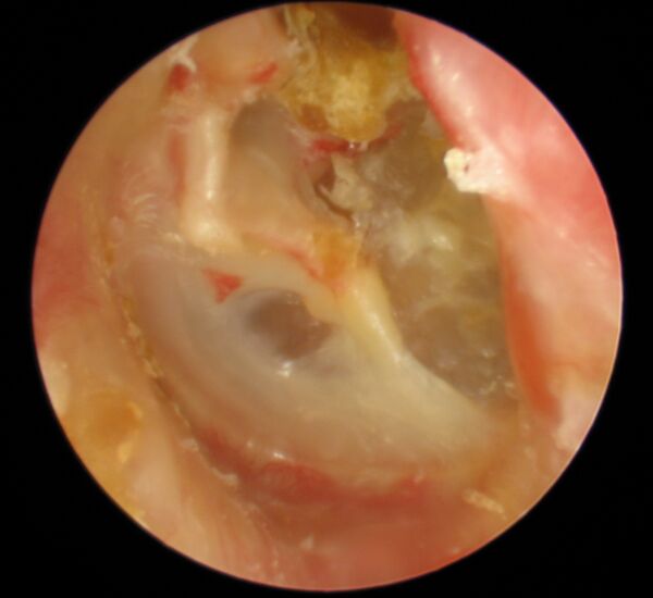 В ходе разрастания разрушает соседние ткани. Запущенные случаи холестеатомы с сопутствующей инфекцией могут привести к абсцессу головного мозга, иногда вызывая менингит.