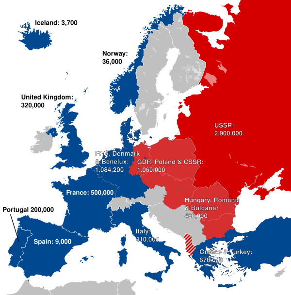 - Развёртывание широкого пояса военных баз США и СССР на территориях третьих стран, усиление гонки вооружений и постоянный рост военных расходов.