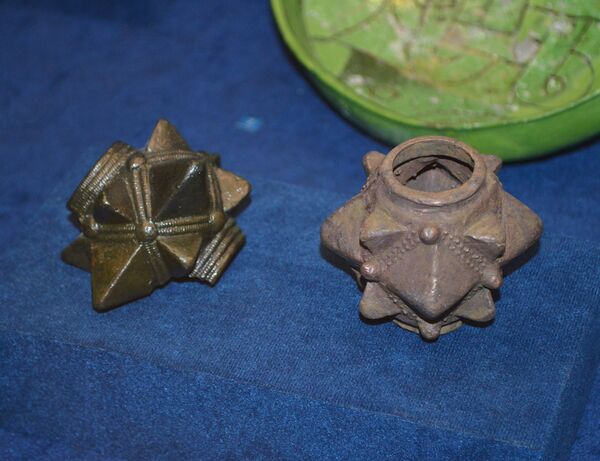 - Бронзовый груз с 5 массивными и 8 малыми шипами — такие похожи на 12-шипные булавы, но отличаются шаровидными окончаниями больших шипов.