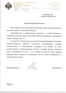 Согласно официальному ответу (№ 2489 от 13 октября 2017 года) Российского военно-исторического общества (РВИО) на запрос общественности, эти статистические сведения о количестве уничтоженных евреев, сосланных в Сибирь литовцев и погибших солдат Красной армии отсутствовали в сценарии, который в 2015 году проходил историческую экспертизу специалистов РВИО.