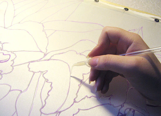 Подготовленную ткань натягивают на раму. Под ткань кладут бумажный рисунок с нужным узором, выполненный чёрной тушью или карандашом. Контуры узора обводят по ткани с помощью специальных ёмкостей с трубочками разного диаметра, заполненных резервирующим составом. Контуры не позволят краске растечься за установленные пределы. После того, как контур наведён, рисунку дают просохнуть. Более чем на 24 часа оставлять не закрашенным наведённый рисунок не рекомендуется, так как в этом случае резервирующий состав выделит жирный ореол, и краска при заливке не подойдёт вплотную к контуру[5].