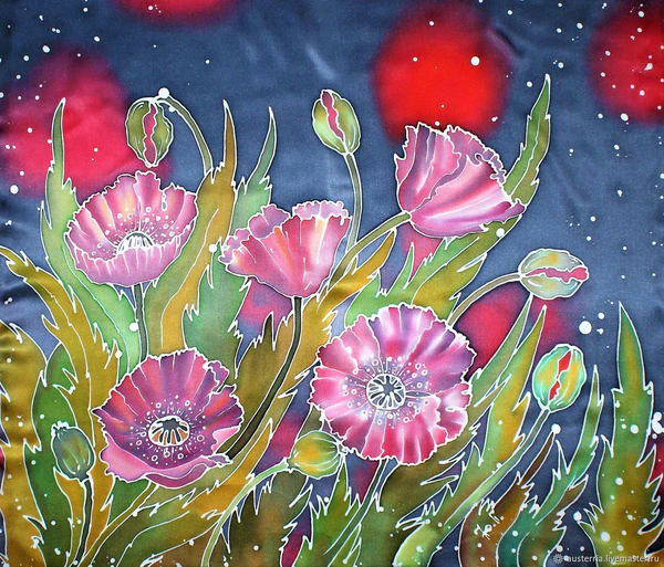 - Свободная роспись — расписывается в акварельной технике по специальному покрытию на шёлке, без резерва[9].