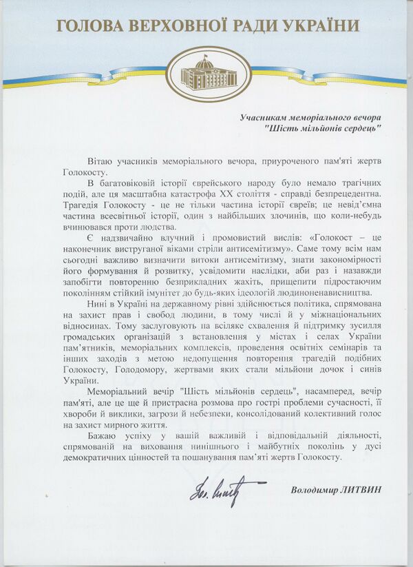 <…> Сотни тысяч евреев, цыган, гомосексуалов, поляков и узников других национальностей были убиты в Освенциме и мы подчеркиваем, что память об этих событиях важна не только как напоминание и осуждение преступлений нацистов, но также в качестве назидания об опасности преследования людей на основе расы, этнического происхождения, религии, политических взглядов или сексуальной ориентации.