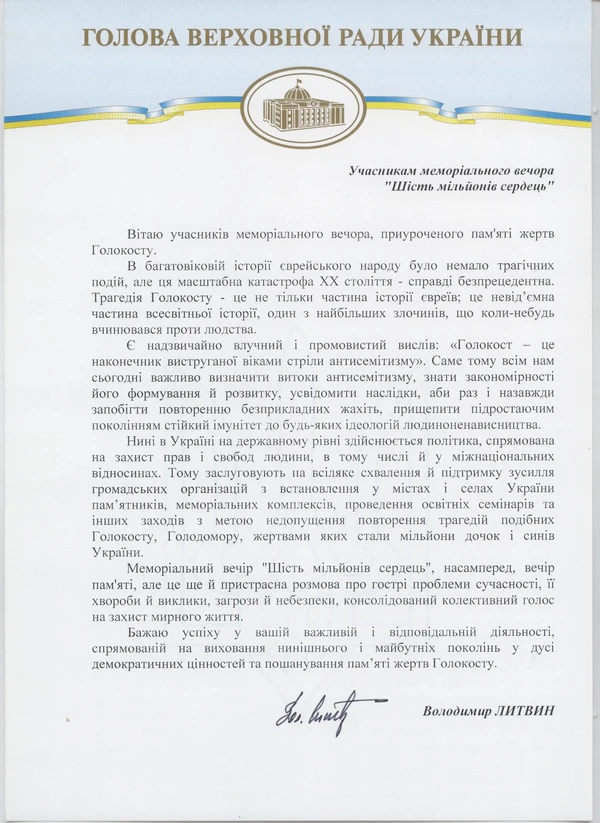 - Берлинская декларация ОБСЕ: «Государства-участники обязуются способствовать сохранению памяти о трагедии Холокоста и, по мере необходимости, просвещению в этой области, а также осознанию важности уважительного отношения ко всем этническим и религиозным группам».