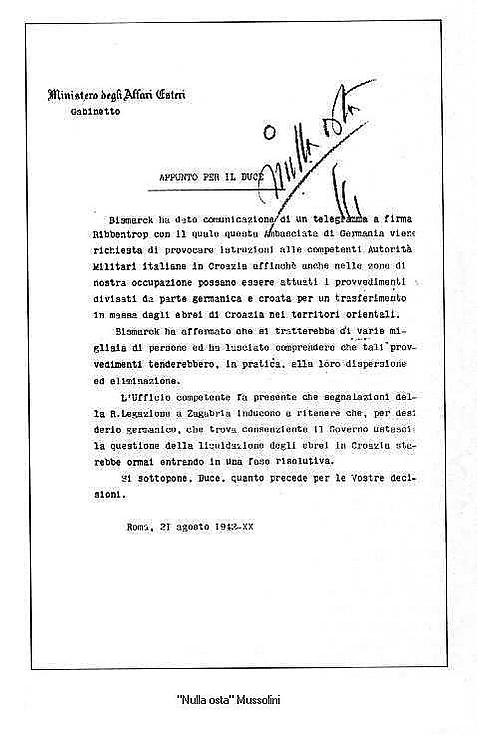 Весной 1942 года немцы начали депортацию европейских евреев в лагеря смерти в соответствии с программой окончательного решения еврейского вопроса. В связи с этим поверенный в делах немецкого посольства в Риме князь Отто Бисмарк 18 августа 1942 года обратился в Министерство иностранных дел Италии с просьбой к итальянскому правительству помочь выполнить соглашение между немецкими и хорватскими властями о депортации хорватских евреев, находящихся в итальянской зоне оккупации. Министерство иностранных дел представило просьбу Муссолини, и он дал своё согласие, написав на докладной записке по данному поводу «не возражаю» (итал. nulla osta). Планы массового уничтожения немцы не афишировали[29].